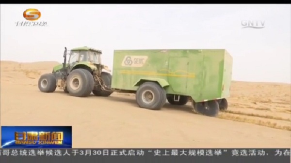 在甘肅武威,眼下,正是固沙治沙的黃金時期,機械固沙車正在涼州區北部九墩灘、騰格里沙漠南部邊緣開展壓沙作業。機械設備利用稻草、麥秸等植物莖桿,在沙漠表面鋪設草沙障,增加了沙漠表面的粗糙度,消減風力,阻止流沙移動,截流雨水。其鋪設效率約為5畝每小時,插草深度約15厘米,高度約30厘米,和人工治沙相比,效率提高近50倍。