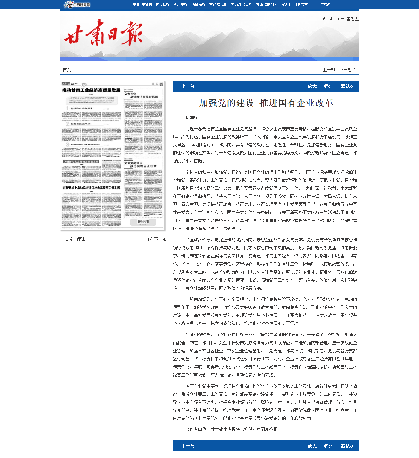 甘肅日報:加強(qiáng)黨的建設(shè) 推進(jìn)國有企業(yè)改革